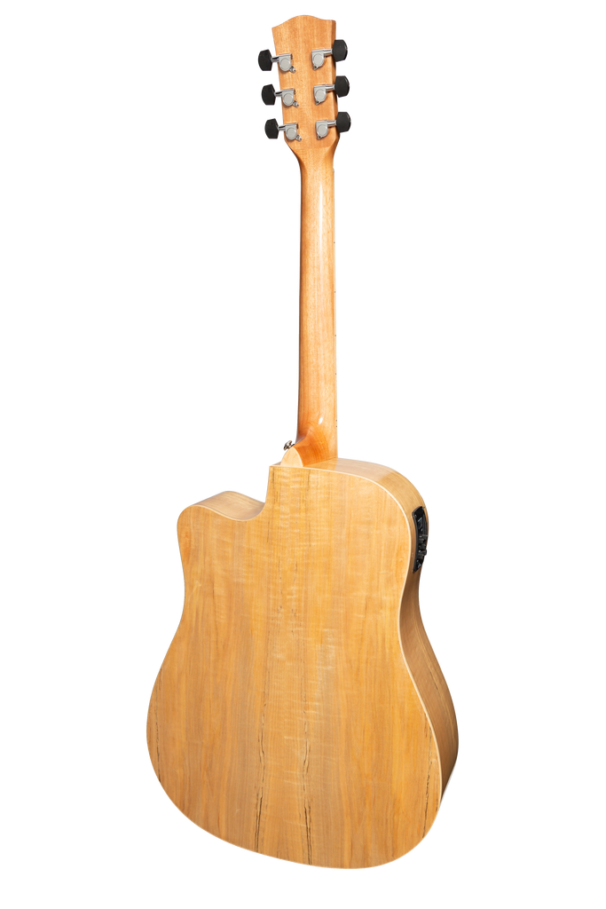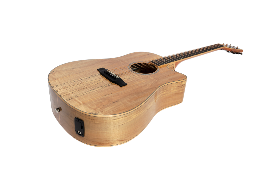 The MDC-31SM-NGL features laminate Spalted Maple top, back and sides, Maple neck, Rosewood bridge and fretboard, ivory style binding, compensated saddle, chrome diecast machine heads, ‘ACUS-4TR’ pickup with 1/4" and balanced XLR outputs, inbuilt tuner and 4-band EQ.