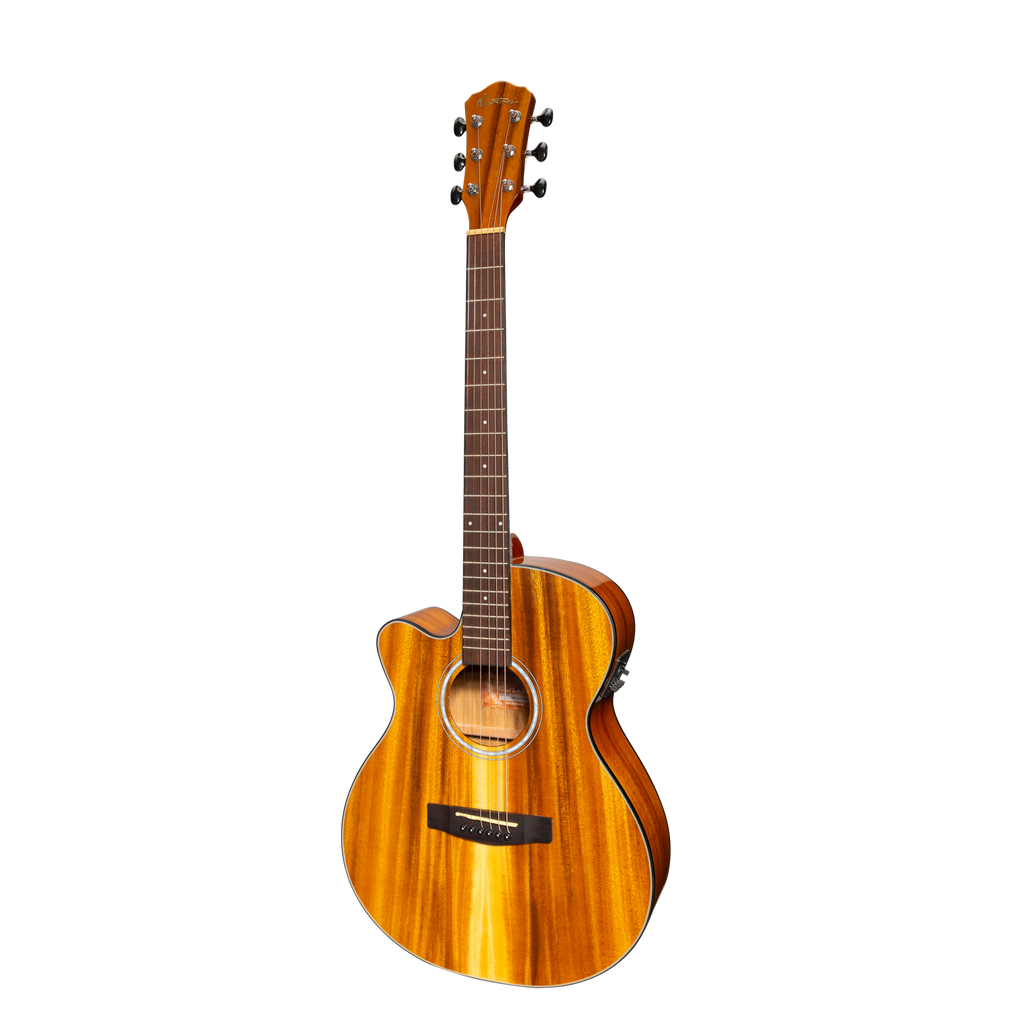 The Martinez '51 Series' Folk Size Cutaway Acoustic-Electric Guitar Koa (Gloss) is an ideal choice for students and intermediate players wanting the tone, feel and appearance of an iconic acoustic guitar in a value-priced package.